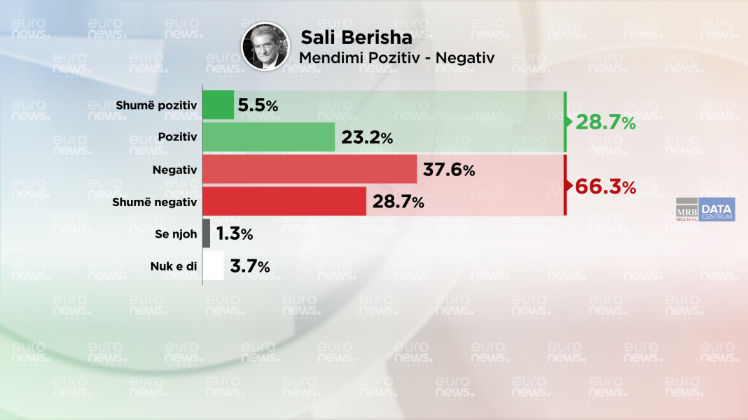 Gjatë periudhës 22 Shtator- 02 Tetor 2024 Datacentrum dhe Barometri – Euronews Albania ka pyetur ballë për ballë 1000 qytetarë në gjithë Shqipërinë lidhur me pëlqyeshmërinë e liderëve kryesorë politikë në vend dhe liderët e partive të reja. Të pyetur nga Barometri Euronews – Albania lidhur me mendimin pozitiv apo negativ për Sali Berishën, 28.7% e qytetarëve kanë mendim pozitiv, ndërsa 66.3% e tyre kanë mendim negativ për të.