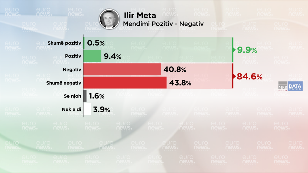 Të pyetur lidhur me mendimin pozitiv apo negativ për Ilir Metën, 9.9% e qytetarëve kanë mendim pozitiv, ndërsa 84.6% e tyre kanë mendim negativ për të.