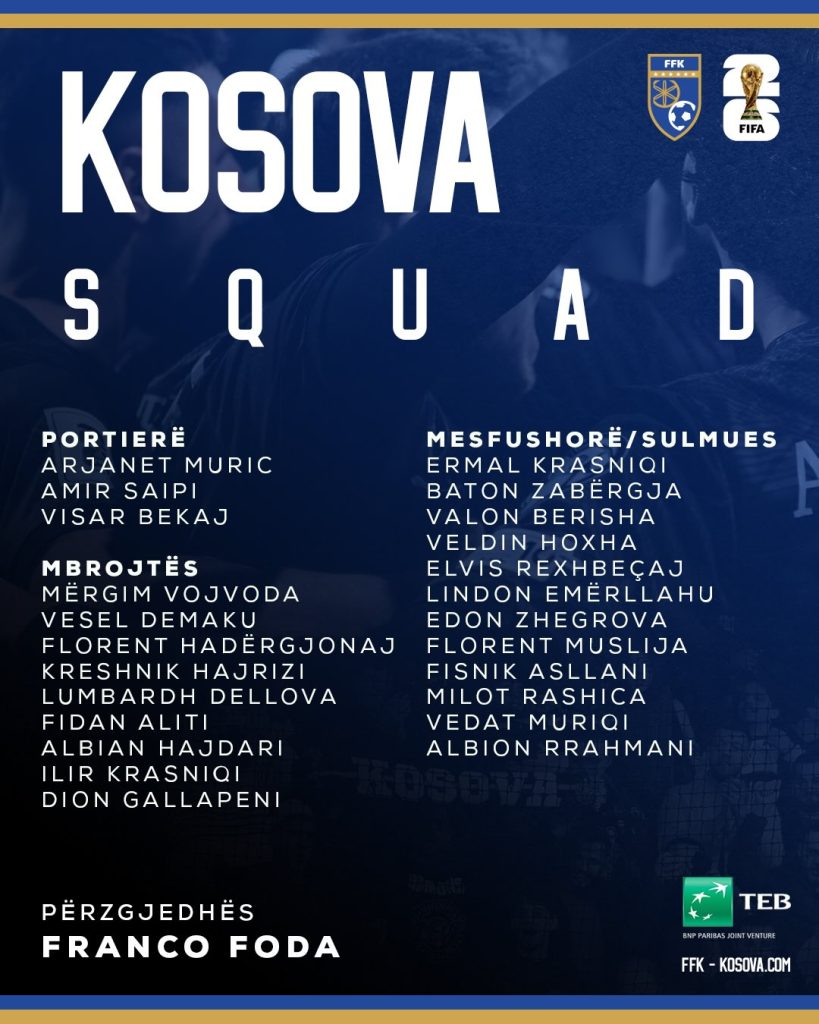 Përzgjedhësi i Kombëtares së Kosovë, Franco Foda, ka shpallur listën e futbollistëve të ftuar për ndeshjet e “play-off”-it për kualifikueset e Kupës së Botës 2026.