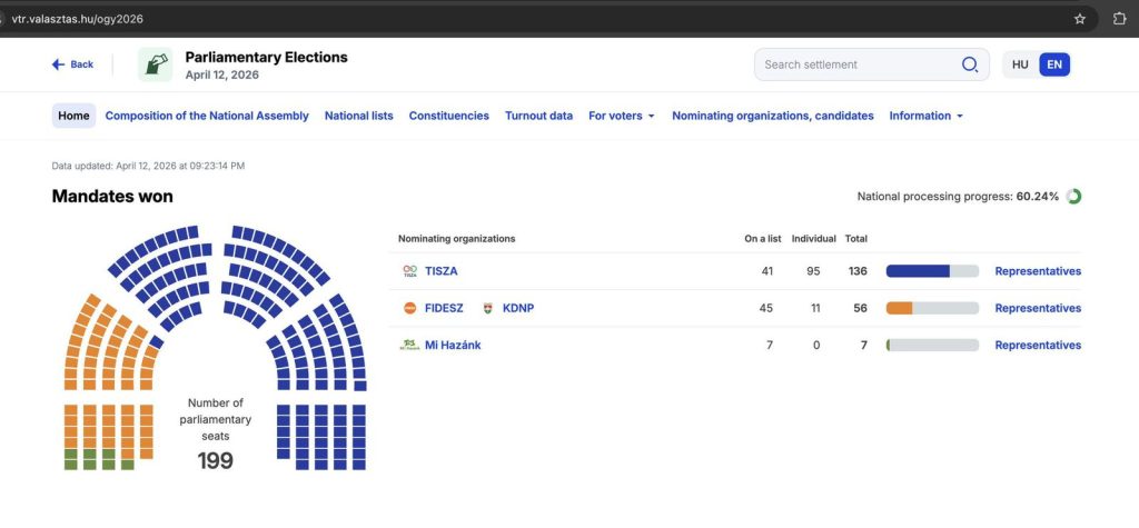 Teksa numërimi i votave vijon në Hungari, rezultat tregojnë se lideri i opozitës Peter Magyar ka arritur të mposhtë kundërshtarin e tij Viktor Orban. Nga rezultatet e publikuara, partia Tisza e Magyar fiton shumicën prej dy të tretash nga 199 vende në Parlamentin hungarez.
